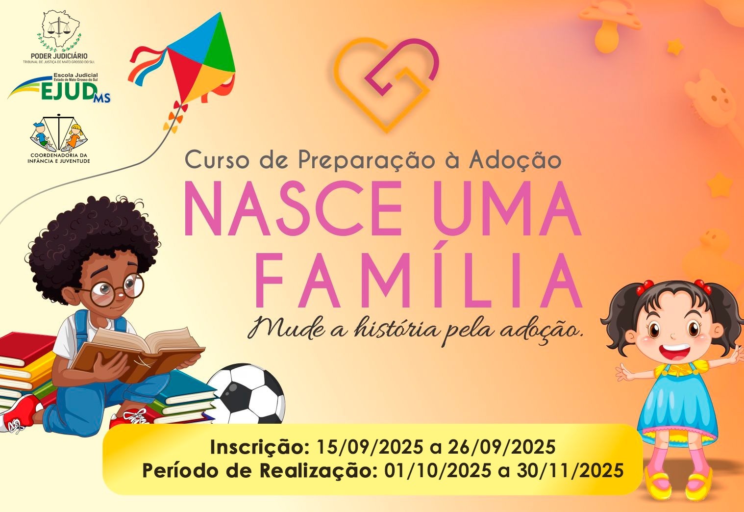 A capacitação tem como objetivo preparar e informar pessoas que desejam acolher crianças ou adolescentes, garantindo que o processo de adoção ocorra de forma responsável. O curso será realizado totalmente em formato EAD, no ambiente virtual da Ejud-MS, entre os dias 1º de outubro e 30 de novembro.