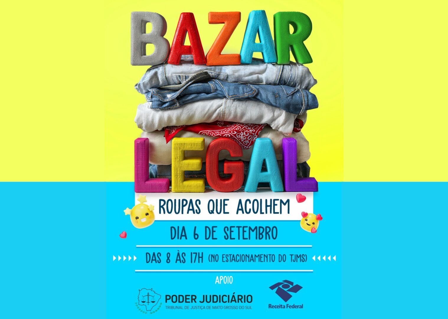 O Tribunal de Justiça de Mato Grosso do Sul, em parceria com a Receita Federal, realiza no próximo dia 6 de setembro o projeto Bazar Legal. A ação tem como objetivo arrecadar fundos para instituições sociais e acontecerá das 8 às 17 horas, no estacionamento do TJMS.