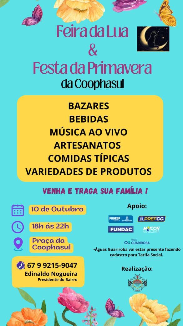 Prepare-se para uma noite encantadora no coração da Coophasul! No dia 10 de outubro, das 18h às 22h, a Praça da Coophasul será palco de um evento que promete reunir o melhor da comunidade: a tradicional Feira da Lua, agora com um toque especial da Festa da Primavera!