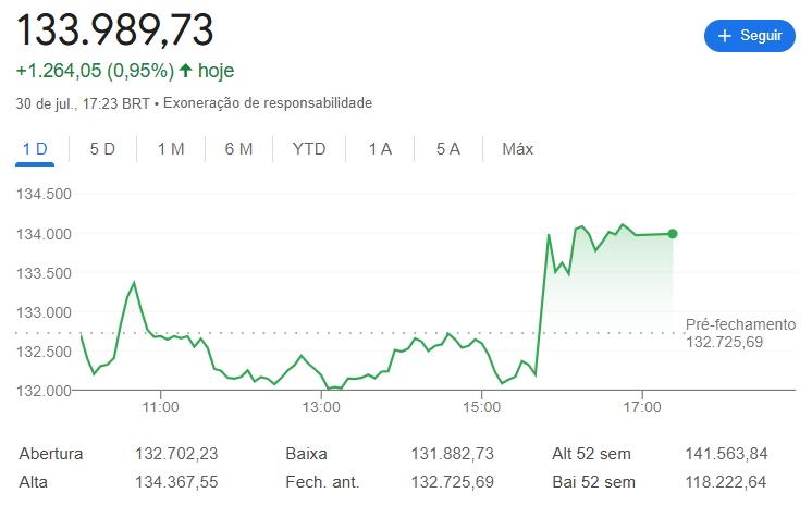 Um dia cheio de emoções, mas com final feliz. Assim foi a sessão desta quarta-feira (30) para o Ibovespa, que fechou com forte alta de 0,95%, aos 133.990 pontos após chegar a ultrapassar os 134 mil pontos, não sem antes cair perto de 0,6% em algum ponto da sessão.