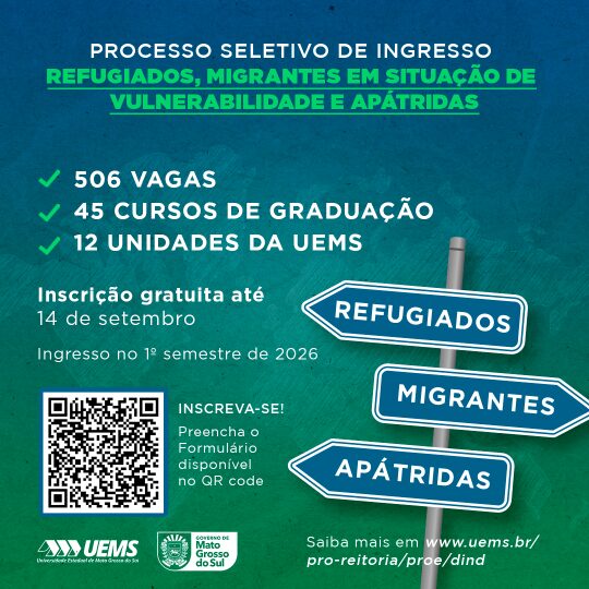 A Pró-Reitoria de Ensino da Universidade Estadual de Mato Grosso do Sul (PROE/UEMS) está com inscrições abertas até 14 de setembro para o processo seletivo de ingresso aos cursos de graduação para Refugiados, Migrantes em Situação de Vulnerabilidade e Apátridas com vistas à seleção de candidatos(as) para o preenchimento de vagas remanescentes nos cursos de graduação da universidade, com ingresso no 1º semestre de 2026.